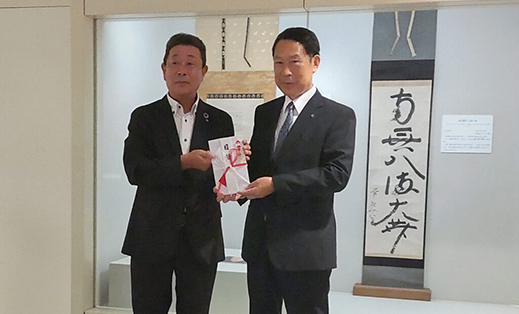 寄贈の模様「尾花市長(左)と弊社 本脇社長(右)」